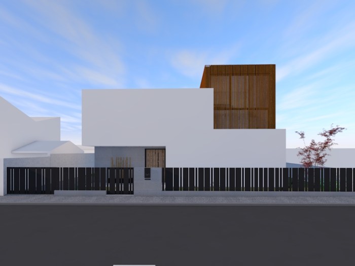 O novo volume abre-se maioritariamente para o interior do lote, deixando a fachada principal livre de vãos, o volume de dois pisos revestido a ripado de madeira faz a marcação de um espaço singular da casa e vai dar acesso à cobertura do volume anterior.